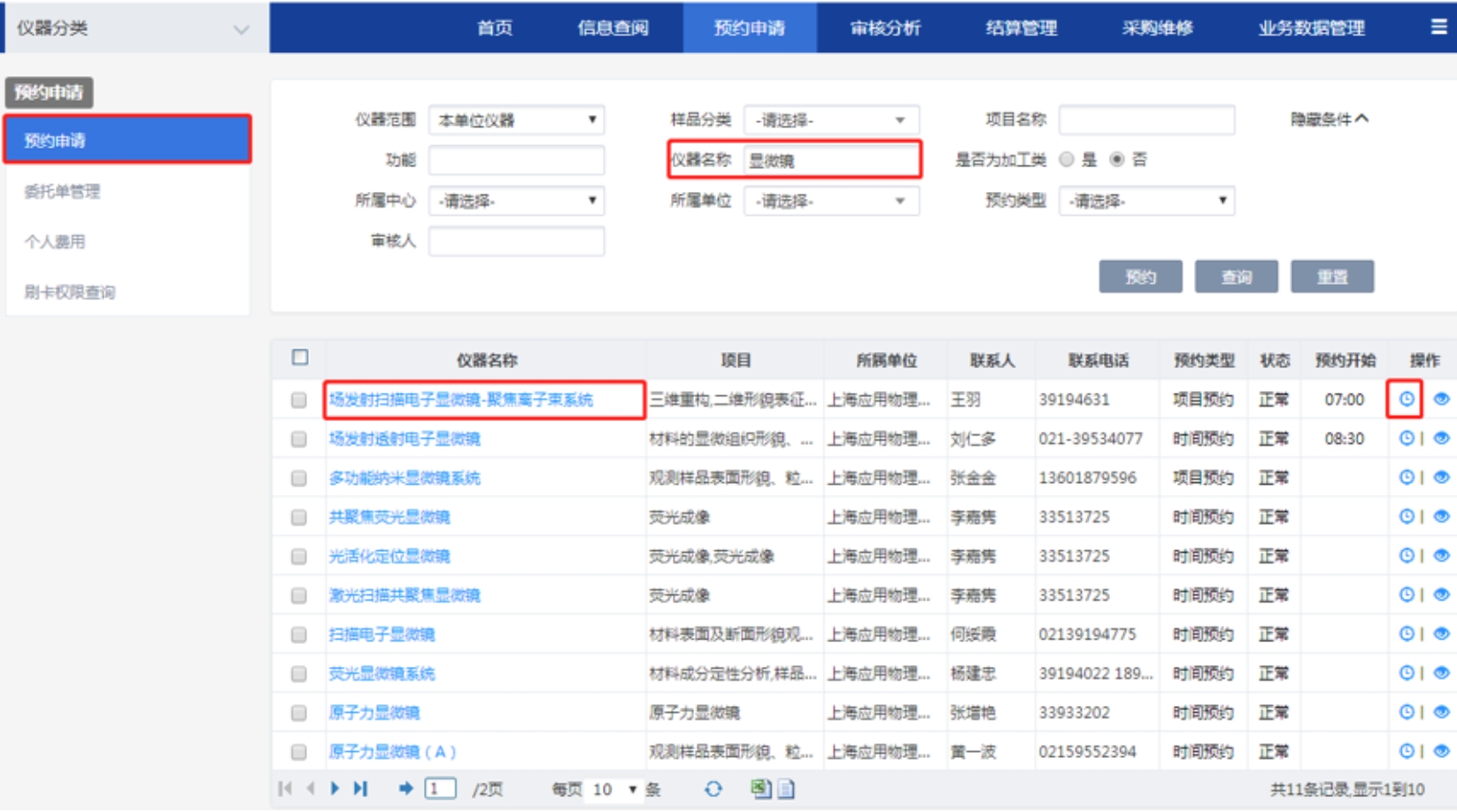 2、 预约测试:登录成功后,点击预约申请,选择查询范围,找到对应的仪器设备,点击仪器名称进入仪器详细信息界面。