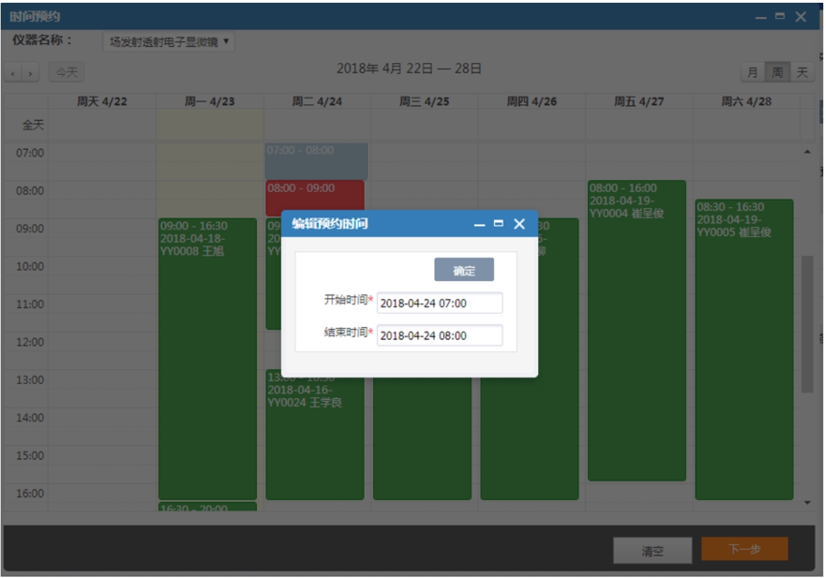 选择检测时间,点击选择日历中灰色区域,编辑预约时间,红色星标为必填项,填写完成点击“确定”,被选中的时间段显示红色。