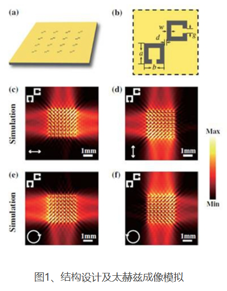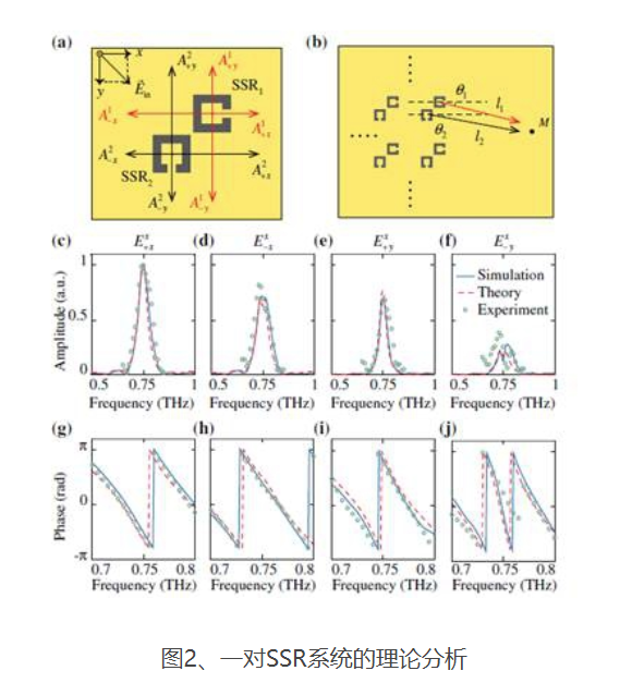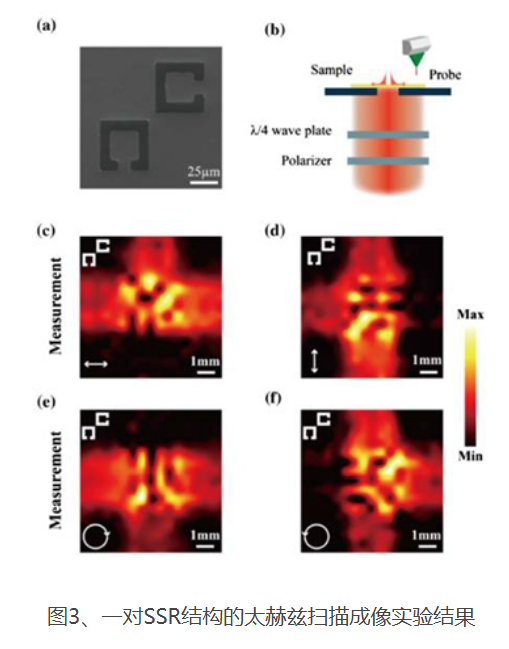 通过理论分析以及实验验证我们发现,通过合理设计一对开口谐振环孔谐振器(split-ring-shaped slit resonator,SSR)之间的耦合,见图1,可在x、y、左旋、右旋偏振光入射下实现不同的非对称表面等离激元的激发。与此同时,入射光的偏振信息被完整保留在激发的表面等离激元中。图2、图3分别是设计结构的理论分析和太赫兹扫描成像实验结果。该设计方案可为偏振传感或偏振控制的表面等离子器件的研究提供新的机遇。