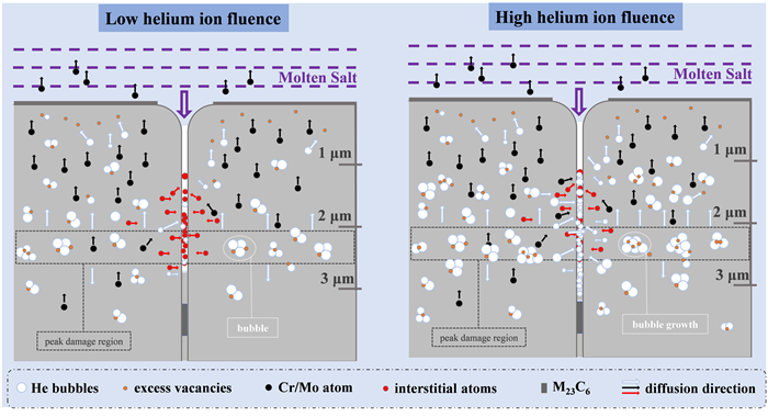 图1. 低/高剂量氦离子高温辐照对Inconel 617基体和晶间腐蚀的影响机制示意图