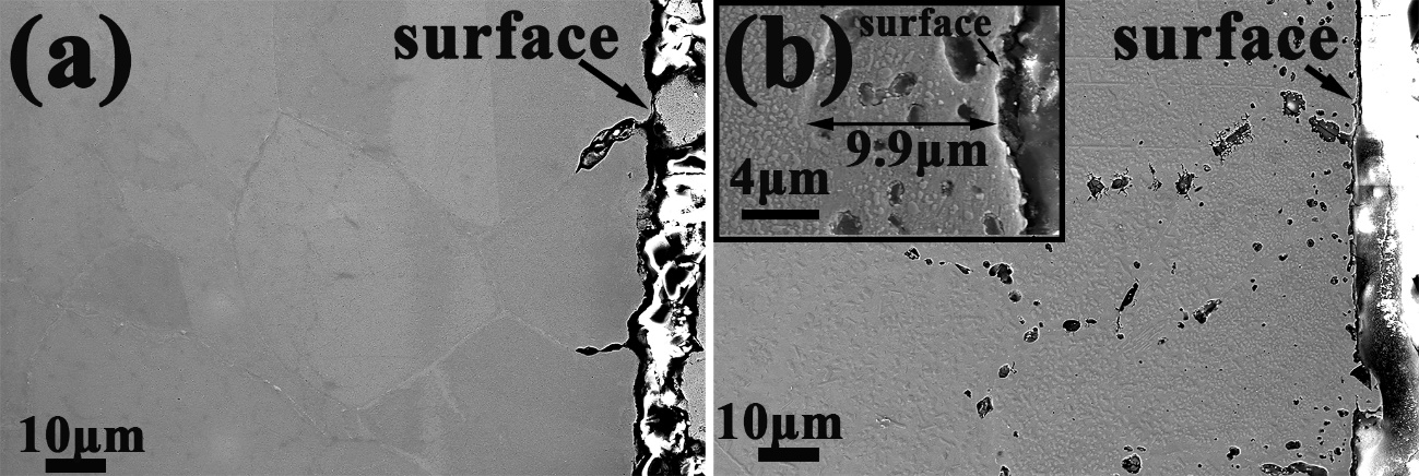 图1. 700 ℃高温NaCl-KCl-MgCl2盐中腐蚀后的316H (a)和渗碳316H (b)的截面图