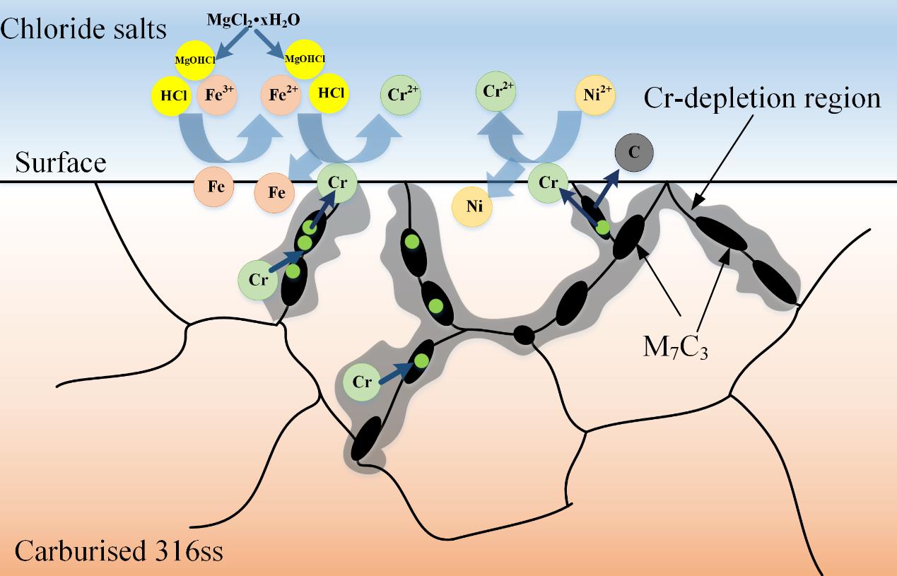 图2. 渗碳316H不锈钢的高温氯盐腐蚀机理示意图