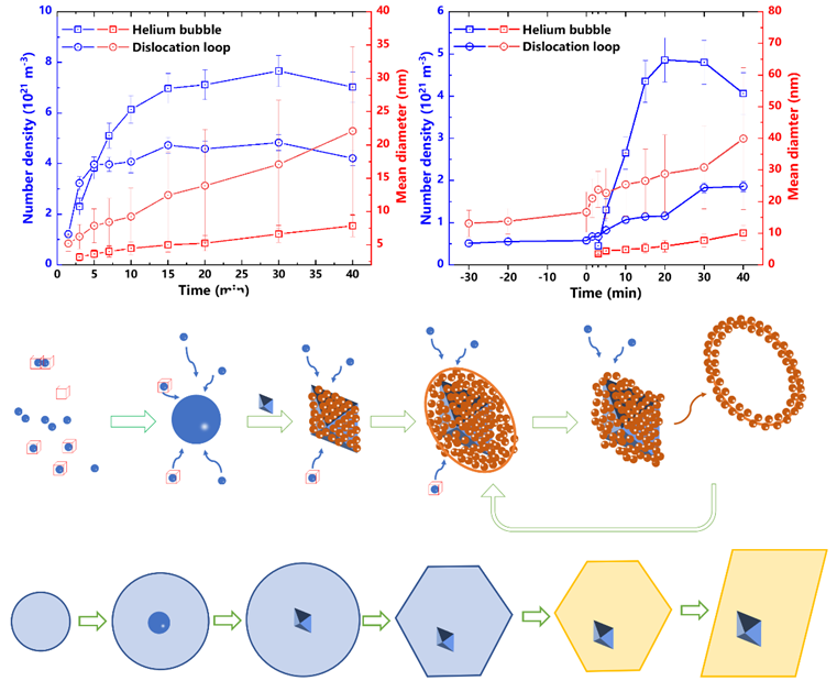 通过原位TEM揭示了双束离子辐照镍基合金中氦泡和位错环的协同演化机制,包括位氦泡挤压位错环形成及发射机制和菱形位错环形成机制。