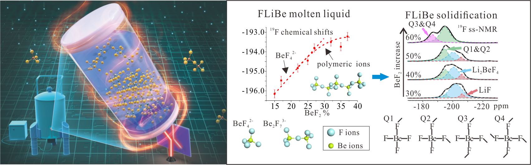 LiF-BeF2(FLiBe)熔融盐由于其优秀的物理、化学性质及耐辐照、中子特性好等特点,是第四代熔盐核能反应堆系统中冷却剂及核燃料载体的重要候选。熔盐离子的微观配位结构对离子的扩散及运动能力有重要影响,从而影响熔盐的黏度、密度等宏观热物性,因此对熔盐反应堆系统的安全稳定具有重要作用。然而,由于缺少合适的表征手段,对于FLiBe熔盐微观结构的研究目前主要还是基于理论模拟,基于实验手段尤其是高温原位表征方法对其微观结构的系统研究鲜有报道。熔盐部研究团队结合高温原位核磁共振技术以及固体核磁共振技术对FLiBe液态熔盐的微观离子结构及其固化产物结构进行了详细的讨论。该工作结果表明在高温液态FLiBe熔盐中,由于Be具有较强的共价性,除了孤立的BeF42-、Be2F73-等络合离子外,还会逐渐生成链状的类高分子的聚合离子形式,并且随BeF2组分浓度的升高,链状聚合离子会逐渐成为体系中的主要离子成分,对离子运动能力等有重要的影响;当熔盐固化后,会生成大量的链状或网络状的非晶玻璃态成分,与硅酸盐玻璃材料的结构较为相近。这些结果为理解FLiBe熔盐的热物性以及熔盐配比的选择及优化提供了启示和理论知道。