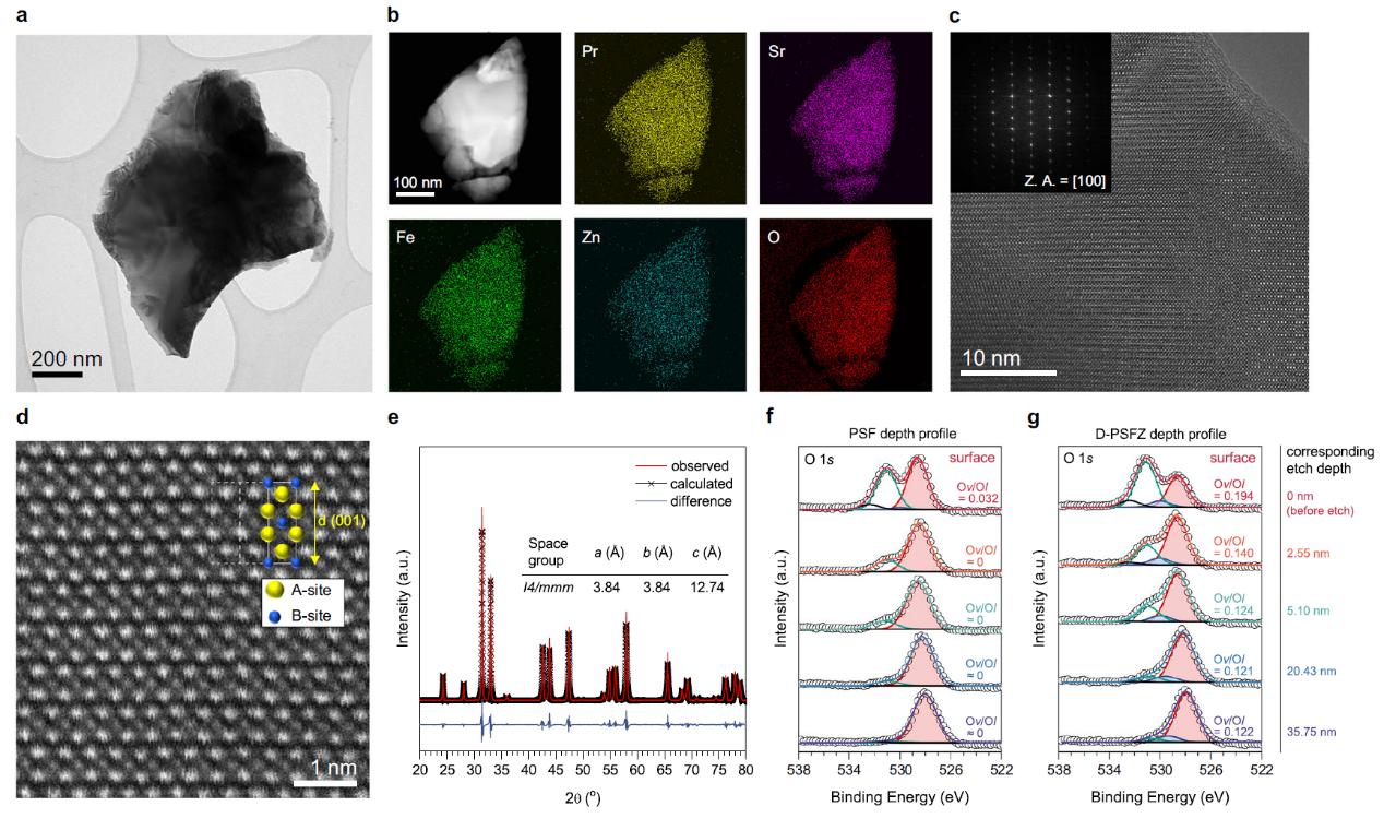 目前工业生产H2O2的蒽醌法需要昂贵的催化剂和大量的氢气,并且能源消耗很大。同时,H2O2的不稳定性也给运输和储存带来了安全问题。通过以可再生电能为动力的氧还原反应(ORR)或水氧化反应(WOR)合成H2O2已成为一种经济、高效的选择。项目团队开发了一种富氧空位的Pr1.0Sr1.0Fe0.75Zn0.25O4- (D-PSFZ) 钙钛矿氧化物,可以很好地结合反应中间体以促进选择性和高效的双电子转移途径。这些氧化物在较宽的电位范围(0.05 至 0.45 V,相对于可逆氢电极)内表现出卓越的氧气还原法拉第效率(约 99%),在高离子强度下的电流密度超过 50 mA cm-2。进一步的研究发现,这些氧化物在低过电位(0.39 V)条件下对双电子转移水氧化反应具有高选择性(约 80%)。论文设计了一种采用双功能电催化剂的无膜电解器,在2.10 V和50 mA cm-2时实现了创纪录的163.0%的高法拉第效率。这是首次报道在新型无膜电解槽中利用高效双功能氧化物同时催化氧还原和水氧化反应,以实现可扩展的过氧化氢电合成。
