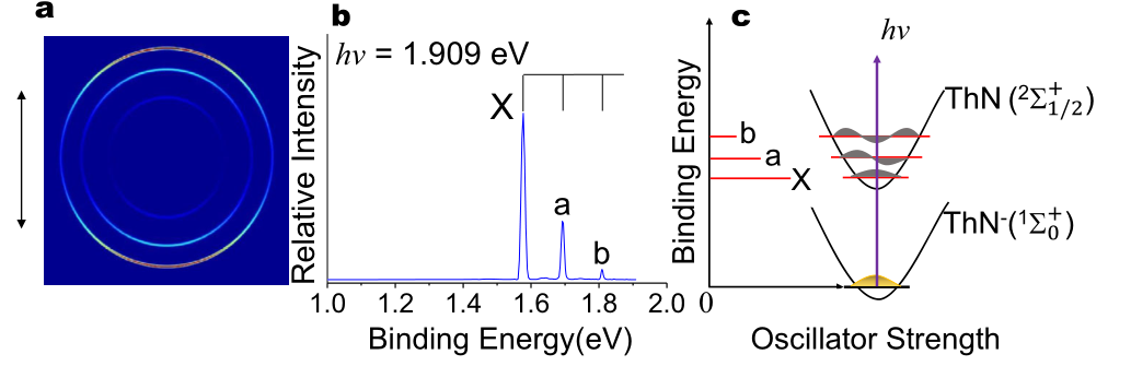 文章报道了低温慢电子速度成像技术获取的ThC-和ThN-负离子的光电子能谱图,以极高的精度测量了ThC和ThN分子的电子亲和能(EA)分别为1.562 eV和1.576 eV。实验测量结合理论计算揭示了在ThN分子中钍与氮之间存在四重键相互作用,与ThC分子具有相似的成键模式。这一研究结果打破了人们对于主族元素氮最高只能形成三重化学键的常规认识,而且对于从化学键角度理解钍金属元素的碳化物和氮化物分子稳定性具有重要意义。