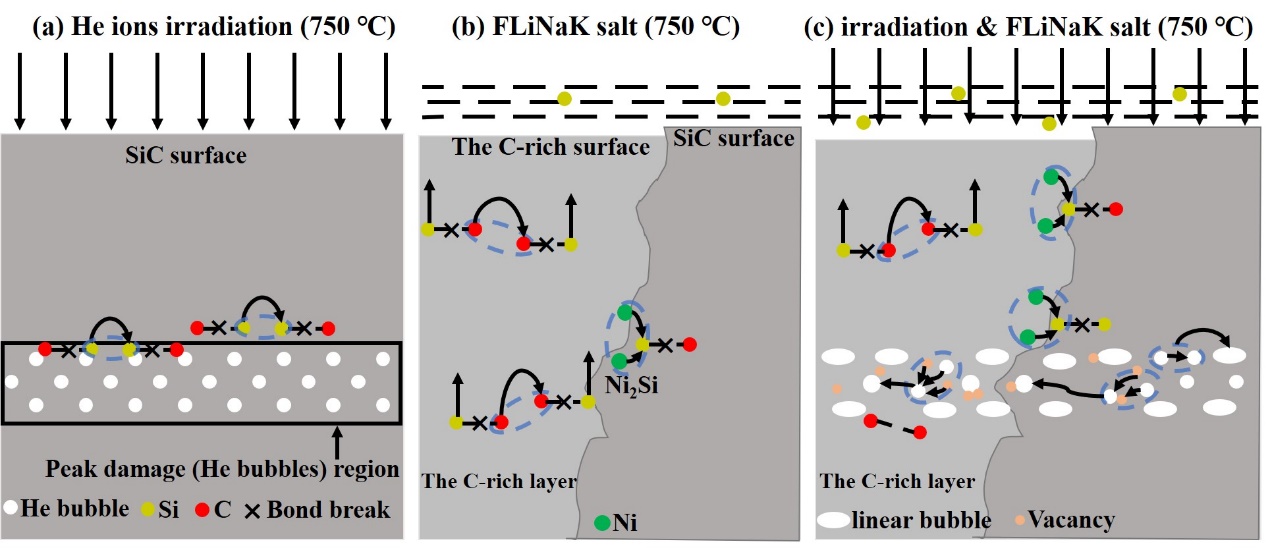 近期,中国科学院上海应用物理研究所材料研究部在辐照/熔盐腐蚀耦合下碳化硅(SiC)材料服役行为研究取得重要进展。相关成果以“Synergistic damage behavior of He ion irradiation and molten salt corrosion in SiC at 750 oC”为题,发表于Journal of Advanced Ceramics期刊(IF=18.6),论文的第一作者是硕士研究生张建峰,通讯作者为李健健副研究员。