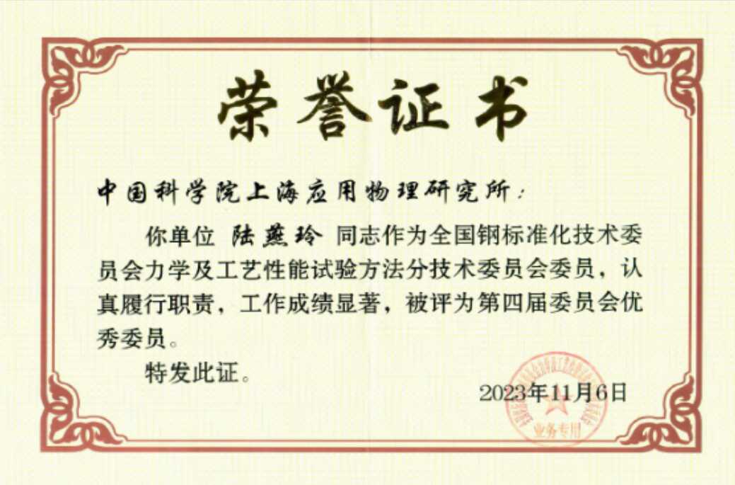 全国钢标准化技术委员会力学及工艺性能试验方法分技术委员会编号TC183/SC4,由中国钢铁工业协会筹建、指导,负责全国金属力学及工艺试验方法等专业领域标准化工作。陆主任从事材料力学性能评估20余年,熟悉金属材料的力学、热学、微观结构分析检测方法,牵头起草了多项国家标准。被评为优秀委员,不仅是对陆燕玲主任认真履行职责的充分肯定,同时也是对其专业能力的高度认可。今后,陆主任将会继续积极参加钢标委力学分委会的相关工作,为各项标准的制修订提供有效的意见和建议。