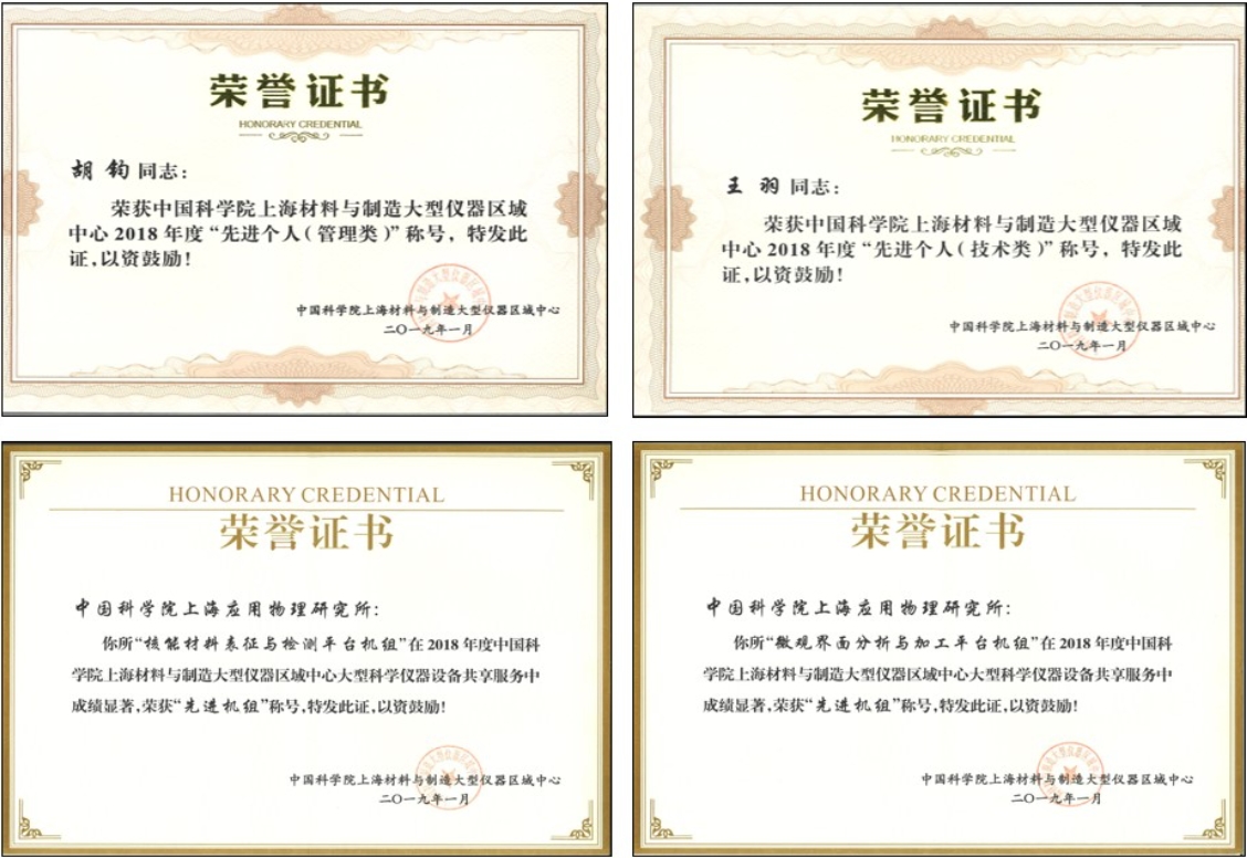 会上,区域中心对2018年度先进个人和先进集体进行了表彰,我所所级中心主任胡钧、科研处副处长支敏获得年度“先进个人(管理类)”荣誉、聚焦离子束扫描电子显微镜系统运行负责人王羽获得年度“先进个人(技术类)”荣誉、“核能材料表征与检测平台机组”和“微观界面分析与加工平台机组”(机组名单见下表)获得年度“先进机组”荣誉。