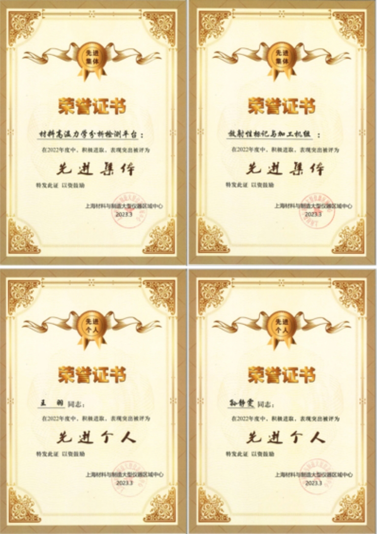 2023年3月10日-11日,上海材料与制造大型仪器区域中心召开“2023年度交流会暨2022年评优总结会”。会上,对区域中心2022年度先进集体和先进个人进行了表彰。所级中心“材料高温力学分析检测机组”、“放射性标记制备与加工机组”荣获年度“先进机组”称号(机组名单见下表)。孙静雯获得年度“先进个人(管理类)”称号、王羽获得“先进个人(技术类)”称号。