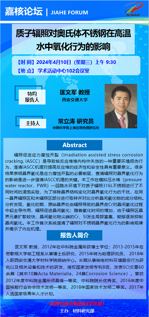嘉核论坛:质子辐照对奥氏体不锈钢在高温水中氧化行为的影响