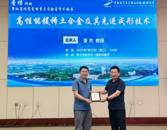 贺战军为本期讲坛致辞,他代表上海应物所对董杰教授及其团队表示热烈欢迎和诚挚感谢,并介绍了香樟讲坛的背景。贺战军表示,依托“香樟讲坛”等平台开展学术交流,对于促进原始创新、活跃学术氛围、拓宽学术视野发挥着重要作用。他希望科研人员能利用好这些平台,交流学术思想、激发创新思维、提高学术水平,助力核科学、核技术领域的交叉协同创新,为加快实现高水平科技自立自强贡献力量。随后,贺战军代表上海应物所向董杰教授颁发了“香樟讲坛”特别纪念证书,董杰教授为讲坛签名留念。