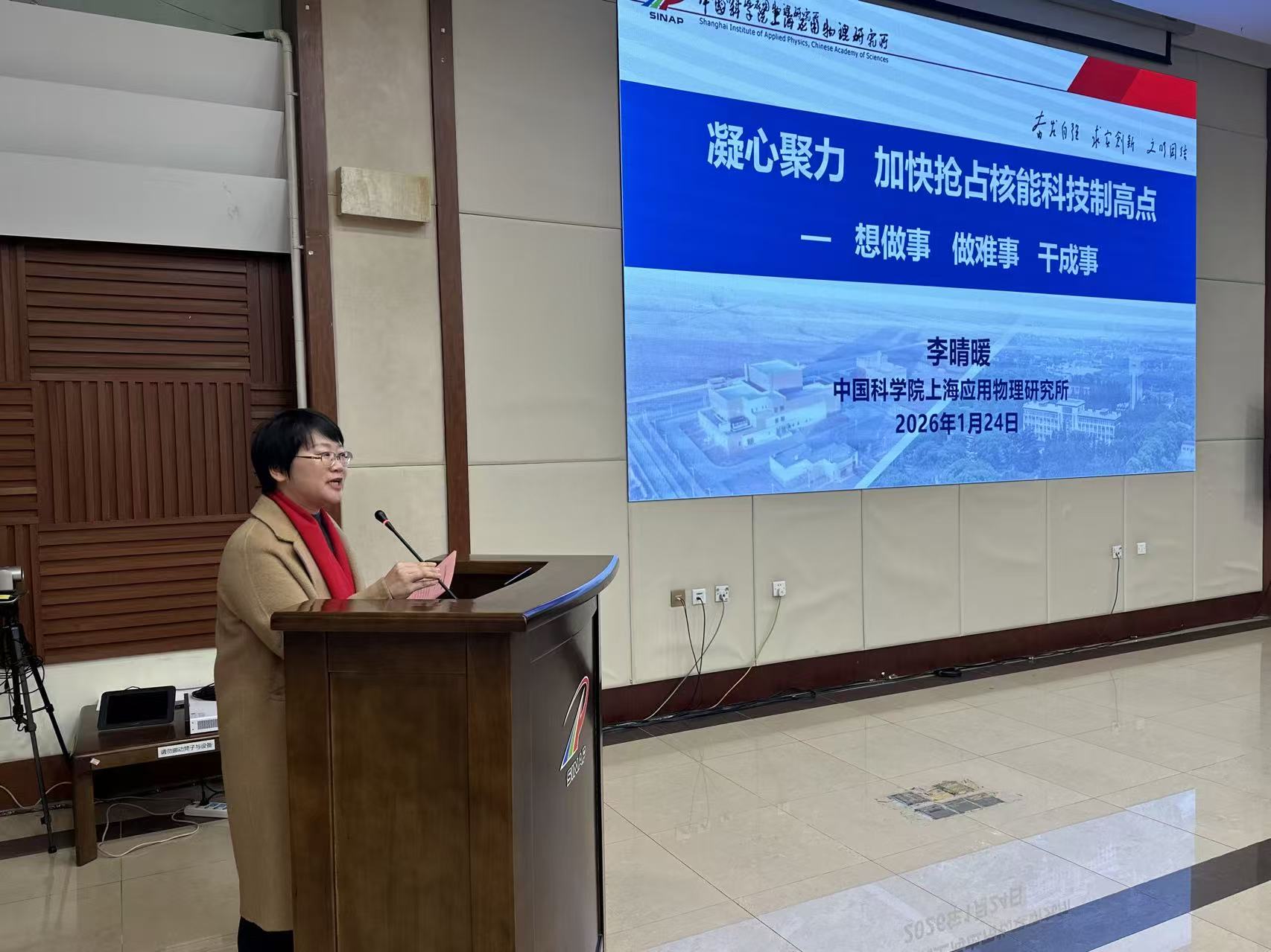 活动在温馨祥和的氛围中拉开序幕。李晴暖代表所领导班子和全体在职职工、研究生,向全所离退休老同志及其家人致以新春祝福。她以“凝心聚力,加快抢占核能科技制高点——想做事、做难事、干成事”为主题,与大家共同回顾了上海应物所的奋斗历程,重点介绍了一年来研究所在国家战略科技力量使命引领下取得的一系列重大科研进展以及未来加快抢占核能领域科技制高点工作展望。李晴暖强调,上海应物所始终坚持以承担国家重大科技任务为己任,持续发扬研究所“奋发自强、求实创新、文明团结”的拼搏精神,以更加昂扬的斗志和更加务实的作风,凝心聚力,全力推进加快抢占核能领域科技制高点。她指出,今天取得的成绩离不开一代代老同志奠定的坚实基础和倾注的心血智慧,老同志们是上海应物所科技创新事业的开拓者、奠基者和见证者,希望大家能够一如既往的为研究所加快抢占科技制高点献策出力,关心和支持研究所改革创新发展,共同创造更加美好的明天。